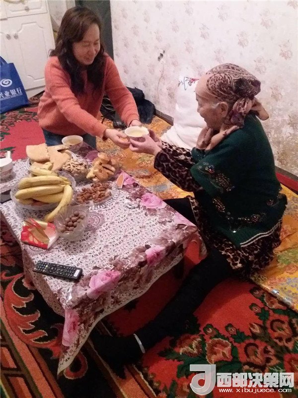 艾來提·賽買提的父親賽買提·阿合買提一面接過韓莉書記手里的米、面、清油和兩大兜食材,一面心疼地埋怨:“這么冷的天,你們又拿這么多東西,多辛苦,你上次送來的東西還沒有吃完呢。”韓莉和王艷萍笑而不語,心里默默地盤算著帶給親戚意外的驚喜。因為艾來提·賽買提和愛人長期兩地分居,聚少離多。今天正好是他們父母結(jié)婚三十周年紀(jì)念日,她們?nèi)嗽缇蜕塘亢靡欢ㄒH手做一頓飯,邀請這個民族團(tuán)結(jié)大院里附近的同事和各自的親戚一起來給這個小家庭舉辦一場別開生面的大融合聚會,她們忙碌著,擇、洗、炒,撲鼻的香味彌漫在親戚的家中……