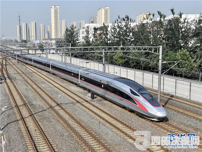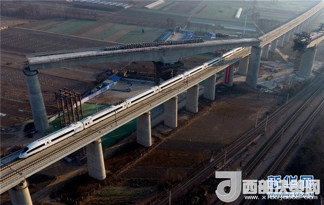 西成高鐵由西安北站駛出的列車經(jīng)過西成高鐵跨西寶高鐵特大橋(12月6日攝)。12月6日,西安至成都高速鐵路全線開通運(yùn)營(yíng),兩地的最短旅行時(shí)間壓縮至4小時(shí)7分。