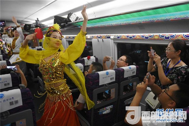 蘭州客運(yùn)段列車員在蘭州鐵路局開行的首趟寶蘭高鐵G2028次動(dòng)車組上為旅客表演節(jié)目(7月9日攝)。7月9日,寶雞至蘭州高鐵正式開通運(yùn)營(yíng),西北的甘肅、青海、新疆由此融入全國高鐵大家庭。