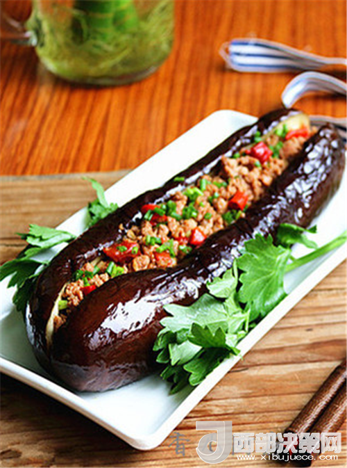 9.把豬肉末加入茄子里再撒上蔥花即可。