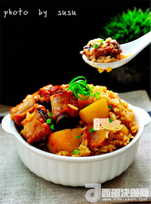 6.電飯煲或壓力鍋里米洗凈,放入適量水,將排骨連醬汁一起倒入,開煲。煮好后撒點蔥花,拌一拌就可以開吃了。