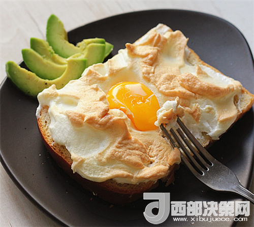 4.用刮刀把蛋白霜涂抹到土司上,不用抹平,中間留個小坑,蛋黃放中間,就用一個雞蛋,只有一個蛋黃。