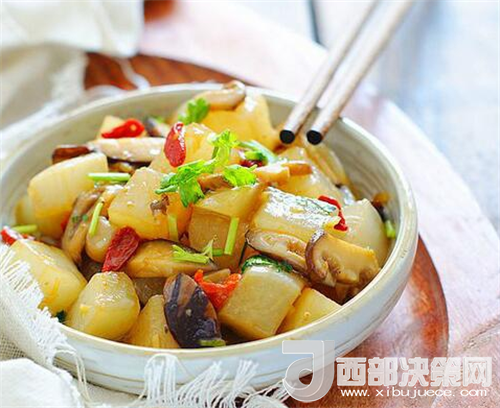 2.將白蘿卜洗凈后切成約1厘米見方的塊,香菇切片。