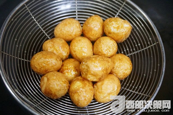 4、油燒到7成熱,倒入鵪鶉蛋,快速炸到金黃,表面金黃即可,炸的時(shí)間不要太長(zhǎng),不然口感老了就不好。