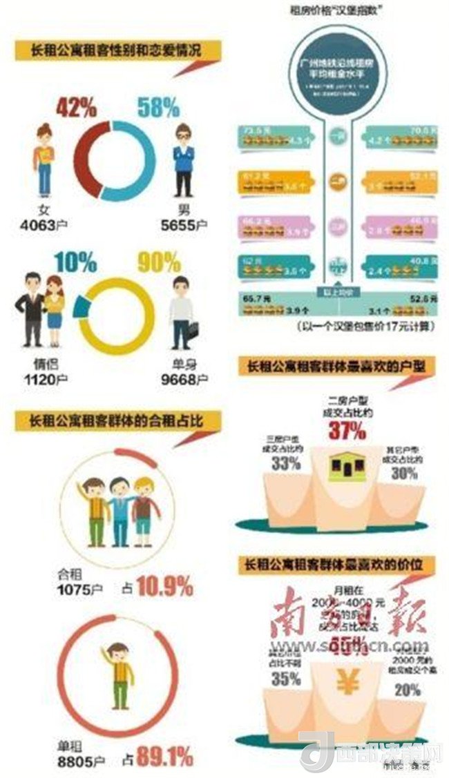 另有統(tǒng)計(jì)表明,廣州的人均租房支出在收入中所占的比例為38%,這意味著對(duì)大部分的租房族來(lái)說(shuō),房租已成為他們每月最主要的開(kāi)支。在廣州,一個(gè)普通漢堡包大概賣(mài)17元,那么在地鐵沿線租房,每平方的月租金可以吃到幾個(gè)漢堡包呢?