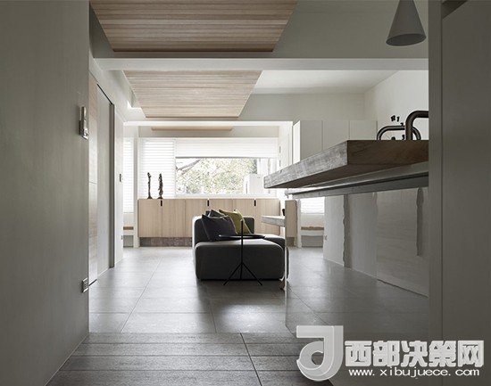 站在長廊一頭視線忍不住會跟著木質(zhì)頂板向前眺望,一直延伸至窗外,室外的采光經(jīng)過漫反射幾乎可以引入整個客廳。