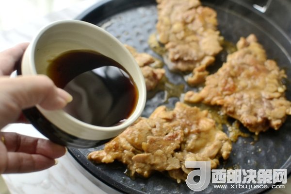 6、然后翻面繼續(xù)煎微黃后加入照燒汁(可以用生抽、蠔油、香油、糖和蜂蜜、適量純凈水拌勻自制)。