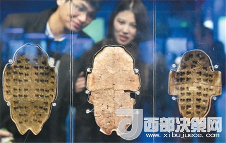 圖為游客在位于河南省安陽(yáng)市的殷墟博物館中參觀(guān)刻有甲骨文的卜甲。(圖片來(lái)源新華社李嘉南 攝)