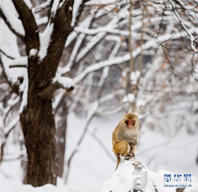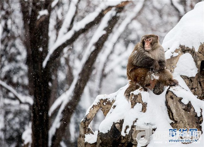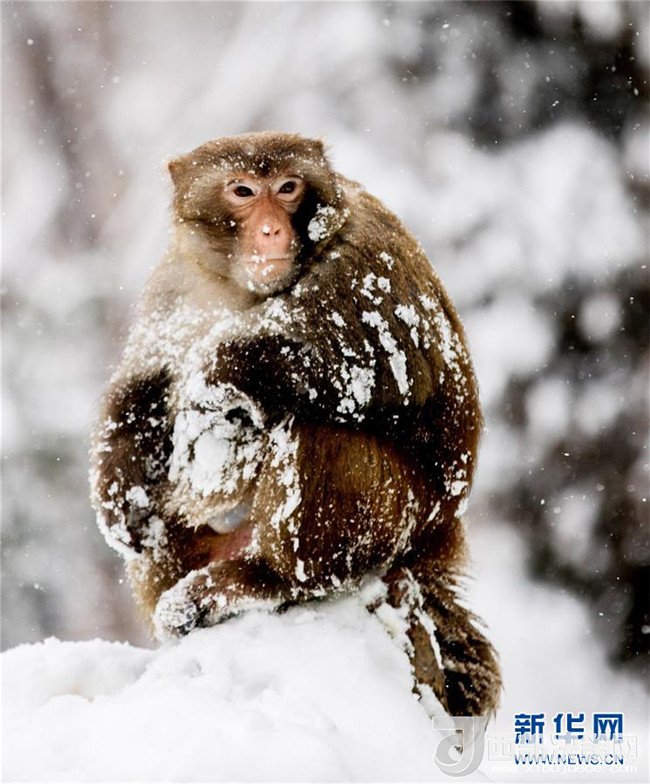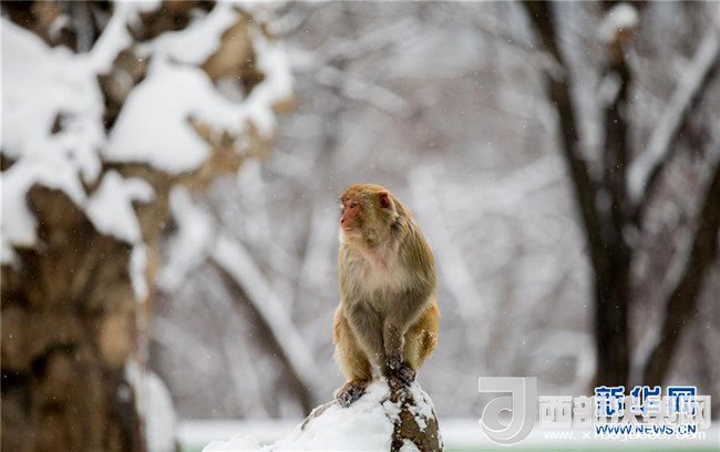 1月4日,安徽省淮北市相山公園的猴子獨立雪中。 當(dāng)日,淮北迎來一場強降雪。(王文 攝)
