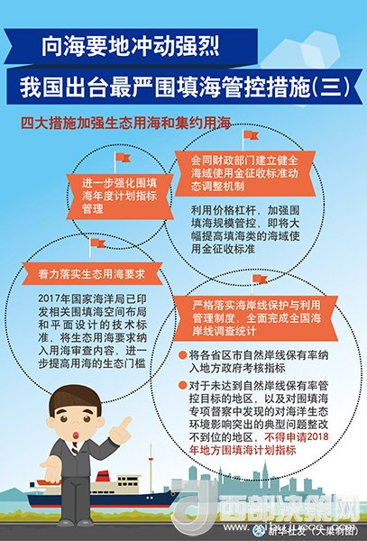 ?。保啡?,國家海洋局舉行圍填海情況新聞發(fā)布會(huì),國家海洋局副局長林山青宣布,結(jié)合圍填海督察整改工作,國家海洋局將采取“史上最嚴(yán)圍填海管控措施”,以期保護(hù)優(yōu)先、集約利用的用海理念牢固確立,使海域開發(fā)利用得到可持續(xù)發(fā)展。