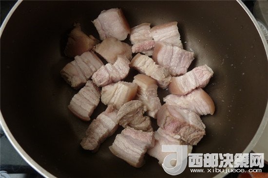 3.鍋內不放油燒熱,把肉切塊后放入