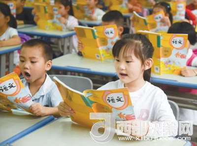 2017年8月31日,安徽合肥少兒藝術(shù)學(xué)校一年級(jí)學(xué)生在開學(xué)預(yù)備課上熟悉新編語文教材。(記者張端攝)