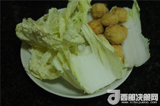 3.在泡紅薯粉絲的時候就將配菜處理好,白菜葉洗干凈,肉丸準備好