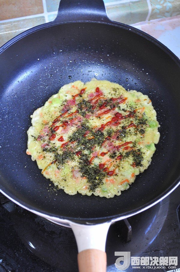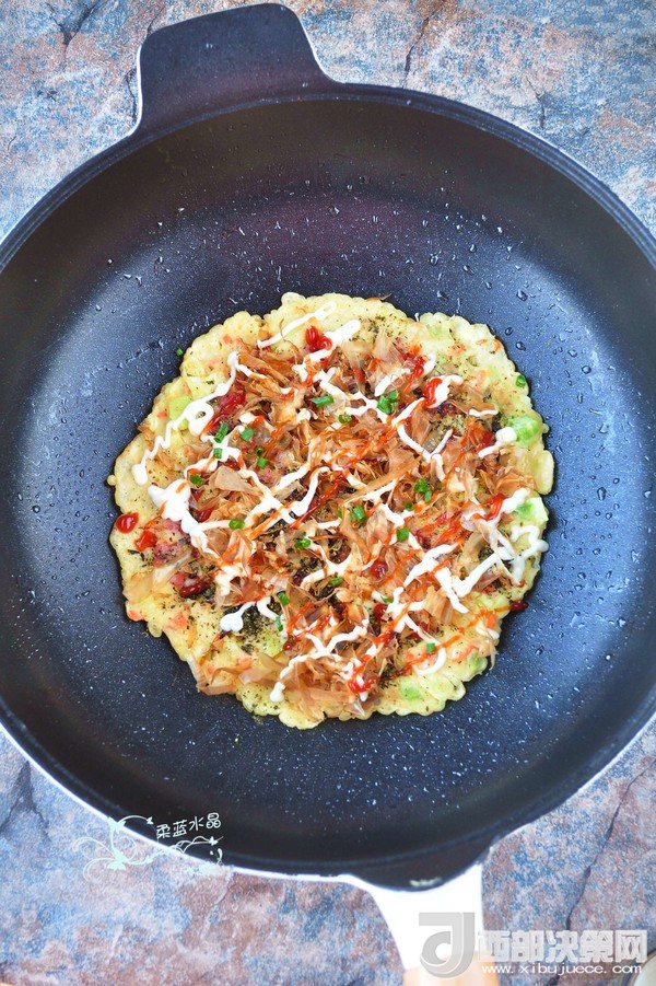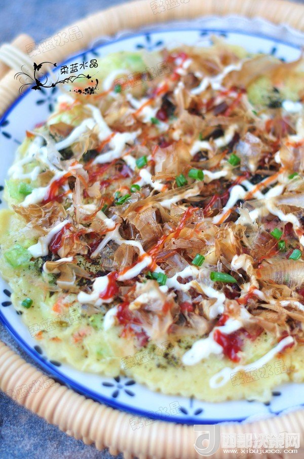 “大阪燒是一種日式蔬菜煎餅,有些地區(qū)根據(jù)日文漢字的寫法,也叫做“御好燒”,為日本關(guān)西的一種民間美食,也是大阪飲食文化的代表。由于外觀的關(guān)系,也有人稱大阪燒為“日本式比薩餅”,可以說放上去的食材,并沒有特殊規(guī)定,一般是自己想吃什么就放什么。吃膩了中式的雞蛋薄餅,換個口味也別俱一格。做這個頂重要的是,一定要用不粘鍋,不然想翻面的時候,底部巴鍋底不動,而且還容易上面的沒熟,下面的已經(jīng)糊了。”
