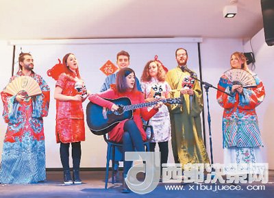 意大利那不勒斯東方大學孔子學院組織迎新春活動,低年級學生唱跳《新年好》。