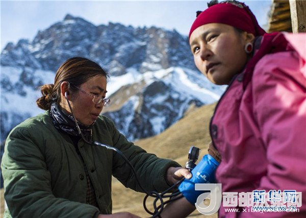 巡診隊(duì)里唯一的女醫(yī)生張紅英(左)在為牧民檢查身體(2017年12月18日攝)。