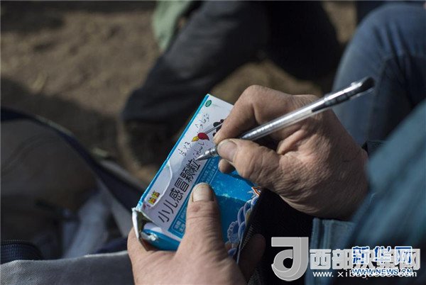 巡診隊(duì)醫(yī)生賽山在藥品上仔細(xì)用哈薩克語注明使用方法(2017年12月18日攝)。