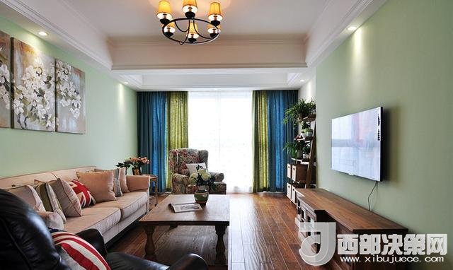 沙發(fā)墻上的油畫和茶桌刪搞得插花,遙相呼應,給人清新自然之感。