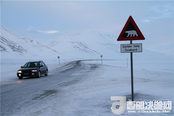 2月25日,在挪威斯瓦爾巴群島首府朗伊爾城,一輛汽車從提示北極熊出沒的警示路標旁駛過。記者梁有昶攝