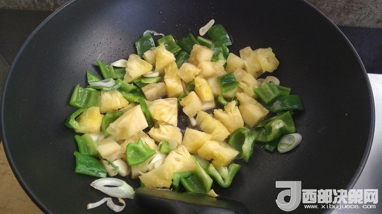 3.菠蘿肉切塊,青椒切塊,蔥姜蒜備用