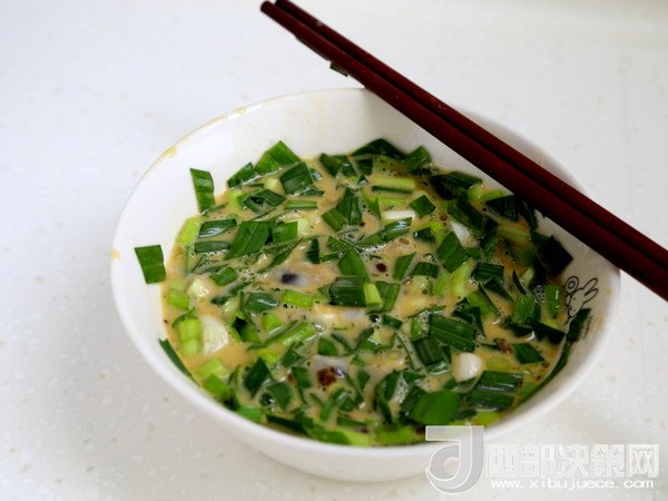 4.用筷子將雞蛋打散,加入切碎的蒜苗,然后全部拌勻備用。
