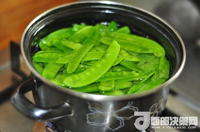 5.水燒開,加點油和鹽,把荷蘭豆下入焯燙斷生。撈出過涼。這樣更綠。
