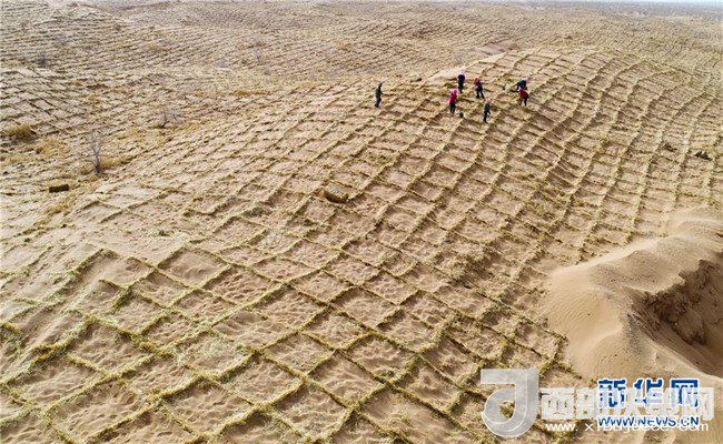 3月27日,在臨澤縣北部干旱荒漠區(qū),人們用麥草筑牢阻沙網(wǎng)。甘肅省臨澤縣位于巴丹吉林沙漠邊緣,沙漠戈壁面積占全縣總面積三分之二以上。連年來,臨澤縣持續(xù)防沙治沙,筑牢生態(tài)安全屏障,目前已建成防風固沙林27.1萬畝,阻沙林帶187公里,封育荒漠植被50萬畝。新華社發(fā)(王將攝)