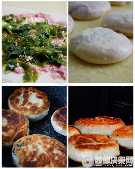 5、餳好的面分段后,搟好薄薄的餅,先涂一層油酥、再抹一層腌制好的肉末、再撒上裙帶菜和香蔥末;