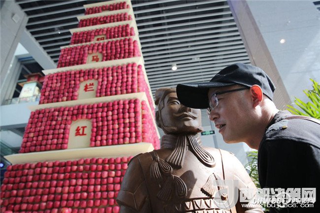 展館里3000多個陜西大蘋果堆出的大雁塔格外醒目,兵馬俑機(jī)器人作為陜西蘋果宣傳大使,能回答觀眾提出的各種問題,尤其是陜西蘋果方面的問題,沒有它回答不出來的。