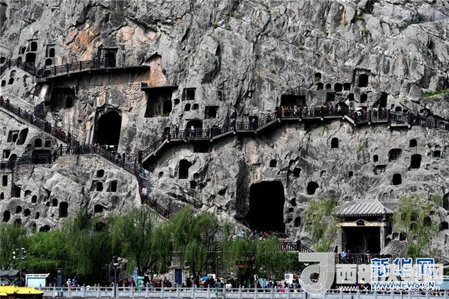 4月11日,游客在河南洛陽(yáng)龍門石窟景區(qū)參觀游覽。