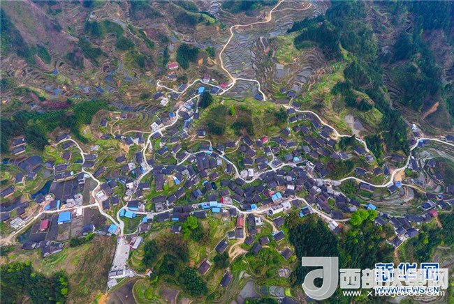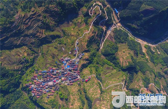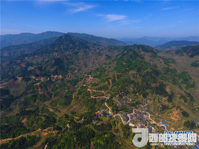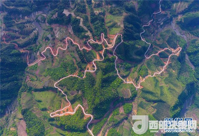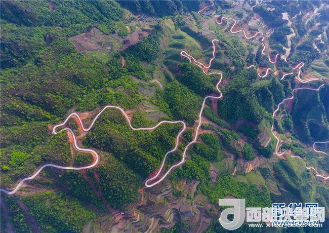 這是借助無人機(jī)拍攝的融水苗族自治縣桿洞鄉(xiāng)錦洞村公路(4月17日攝)。