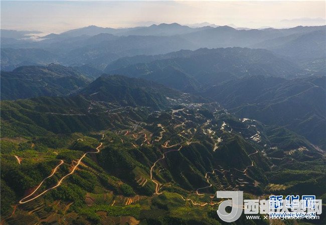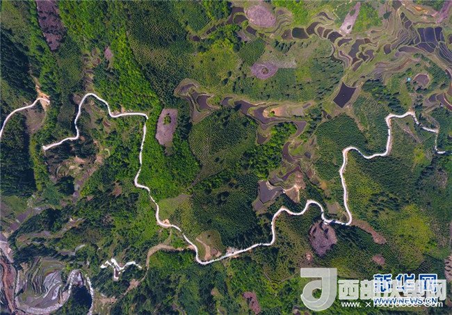 這是借助無人機(jī)拍攝的融水苗族自治縣桿洞鄉(xiāng)花孖村公路(4月18日攝)。