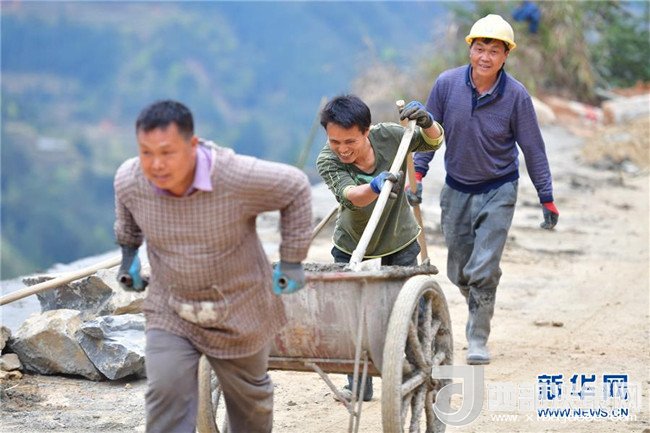 工人在融水苗族自治縣桿洞鄉(xiāng)黨鳩村烏英屯修路(4月17日攝)。