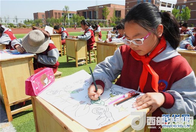4月19日,安徽省合肥市蜀山區(qū)井崗鎮(zhèn)新城小學(xué)學(xué)生參加“善待地球,童繪藍(lán)天——我與地球的故事”繪畫活動。新華社發(fā)(葛宜年 攝)