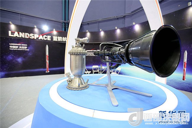 現(xiàn)場(chǎng)展示的藍(lán)箭航天商業(yè)運(yùn)載火箭發(fā)動(dòng)機(jī)等比例模型。新華網(wǎng)才萌攝