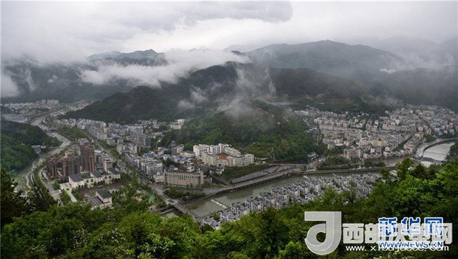 汶川地震后在原址上重建的新青川縣城(4月25日無人機拍攝)。新華社記者陶明攝