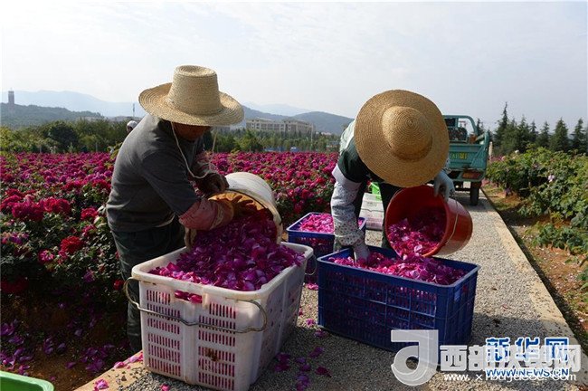4月25日,兩名工作人員在云南大學呈貢校區(qū)的玫瑰園收集已采摘的玫瑰準備送往學校食堂。