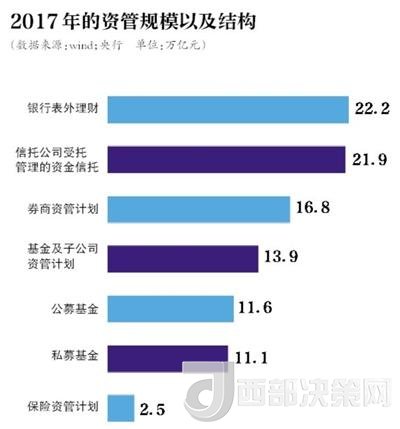 數(shù)據(jù)顯示,近年來我國金融機構(gòu)資管業(yè)務規(guī)模不斷攀升,截至2017年末,不考慮交叉持有因素,總規(guī)模已達百萬億元。其中,銀行表外理財產(chǎn)品資金余額為22.2萬億元,信托公司受托管理的資金信托余額為21.9萬億元,公募基金、私募基金、證券公司資管計劃、基金及其子公司資管計劃、保險資管計劃余額分別為11.6萬億元、11.1萬億元、16.8萬億元、13.9萬億元、2.5萬億元。