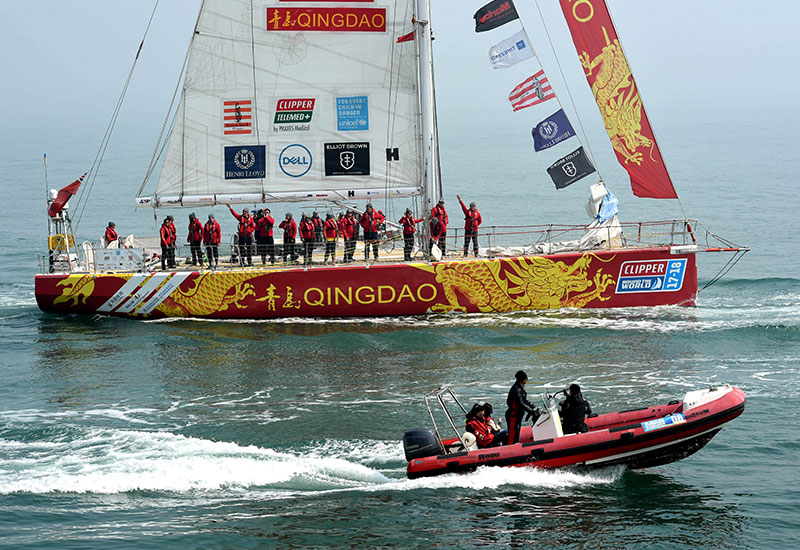 在青島西海岸新區(qū)星光島碼頭,參加2017-2018克利伯環(huán)球帆船賽的青島號(hào)船員與送行的觀眾揮手道別(3月23日攝)。新華社記者 李紫恒 攝