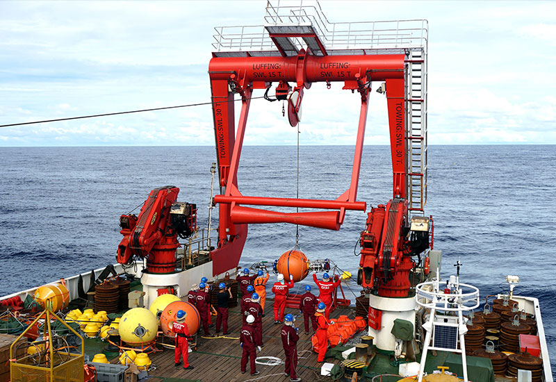 在我國(guó)新一代海洋綜合科考船“科學(xué)”號(hào)上,科考隊(duì)員正在布放潛標(biāo)(2017年12月10日攝)。新華社記者 張旭東 攝