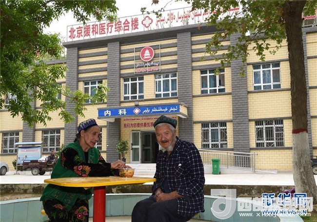 一名維吾爾族患者(右)在新疆和田縣巴格其鎮(zhèn)中心衛(wèi)生院北京援和醫(yī)療綜合樓前準(zhǔn)備吃午飯(4月19日攝)。