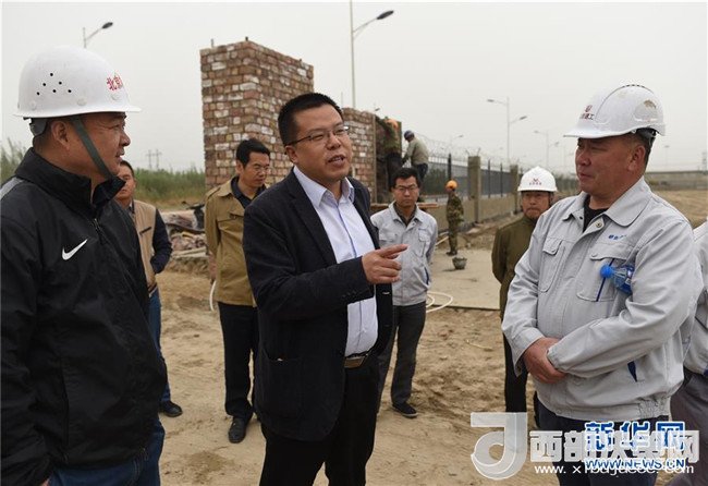 北京援疆干部、墨玉縣委副書記張好生(中)在墨玉縣北京工業(yè)園區(qū)紡織園建設(shè)現(xiàn)場與施工方交談(4月20日攝)。
