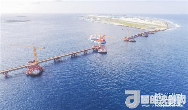 這是2017年7月6日俯拍的馬爾代夫中馬友誼大橋建設(shè)現(xiàn)場。中馬友誼大橋于2016年初正式動工,是中馬共建“一帶一路”的重要合作項(xiàng)目。作為馬爾代夫有史以來第一座大橋,同時也是印度洋上第一座跨海大橋,中馬友誼大橋連通馬爾代夫首都馬累和機(jī)場島,由橋梁、填海路堤及道路等組成,使用壽命100年。新華社發(fā)