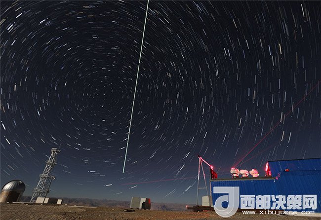 在西藏阿里觀測站,“墨子號”量子科學(xué)實(shí)驗(yàn)衛(wèi)星過境,科研人員在做實(shí)驗(yàn)(2016年12月10日攝,合成照片)。新華社記者 金立旺 攝