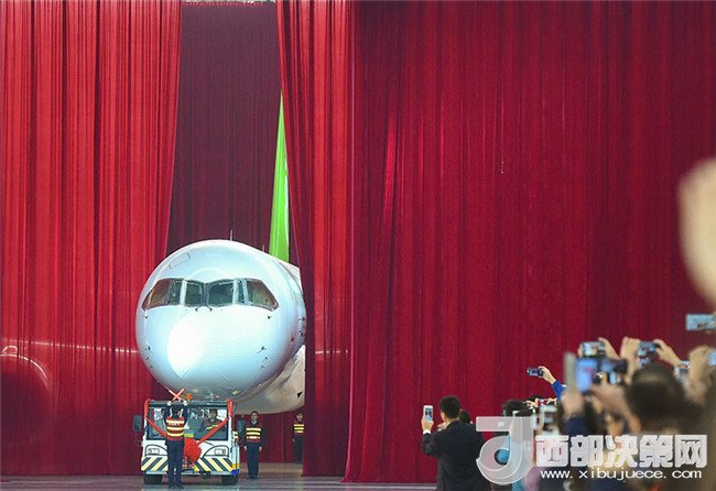 我國自主研制的C919大型客機(jī)首架機(jī),在中國商飛公司總裝制造中心浦東基地廠房內(nèi)正式下線(2015年11月2日攝)。新華社發(fā)(裴鑫 攝)
