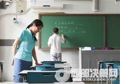 6月6日,北京101中學(xué),監(jiān)考老師在考場做最后檢查。