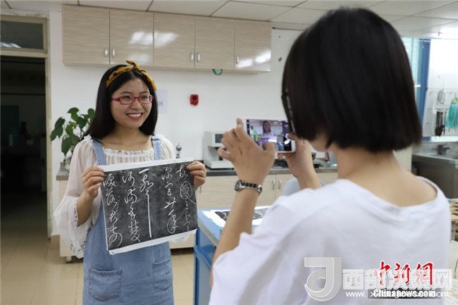 6月9日,一位女同學(xué)與自己的拓片作品合影。當(dāng)日,貴州省古籍保護中心在貴州省圖書館舉辦“古籍修復(fù)技藝體驗”活動。活動開展了古籍修復(fù)、碑文傳拓等技藝體驗。眾多高校師生和民眾紛紛前往體驗。中新社發(fā)瞿宏倫攝