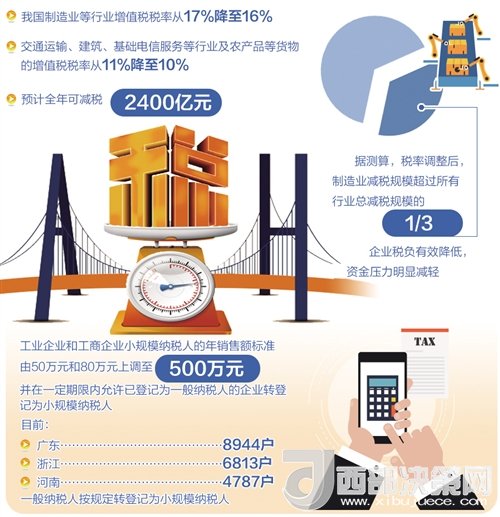 從5月1日起,我國制造業(yè)等行業(yè)增值稅稅率從17%降至16%,交通運(yùn)輸、建筑、基礎(chǔ)電信服務(wù)等行業(yè)及農(nóng)產(chǎn)品等貨物的增值稅稅率從11%降至10%,預(yù)計全年可減稅2400億元。