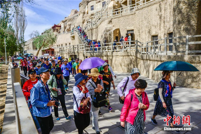 莫高窟標志性建筑“九層樓”前的游人如織。王斌銀 攝