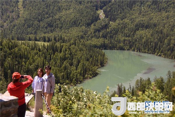 游客在喀納斯景區(qū)月亮灣留影(6月24日攝)。